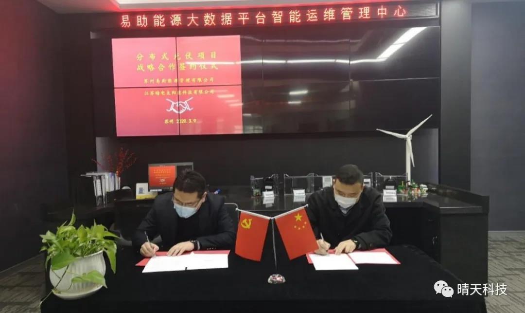 2020年3月9日上午,江苏晴电太阳能科技有限公司与苏州易助能源管理有限公司正式签署了《分布式光伏项目战略合作协议》。江苏晴电太阳能科技有限公司总裁张总、苏州易助能源管理有限公司董事长袁总代表双方公司签约。简单的签约仪式上张总和袁总共同表示,双方将在新能源项目开发、工程承包、智能运营管理和光伏电站检测等多领域开展深度战略合作,共同发展,互利共赢。